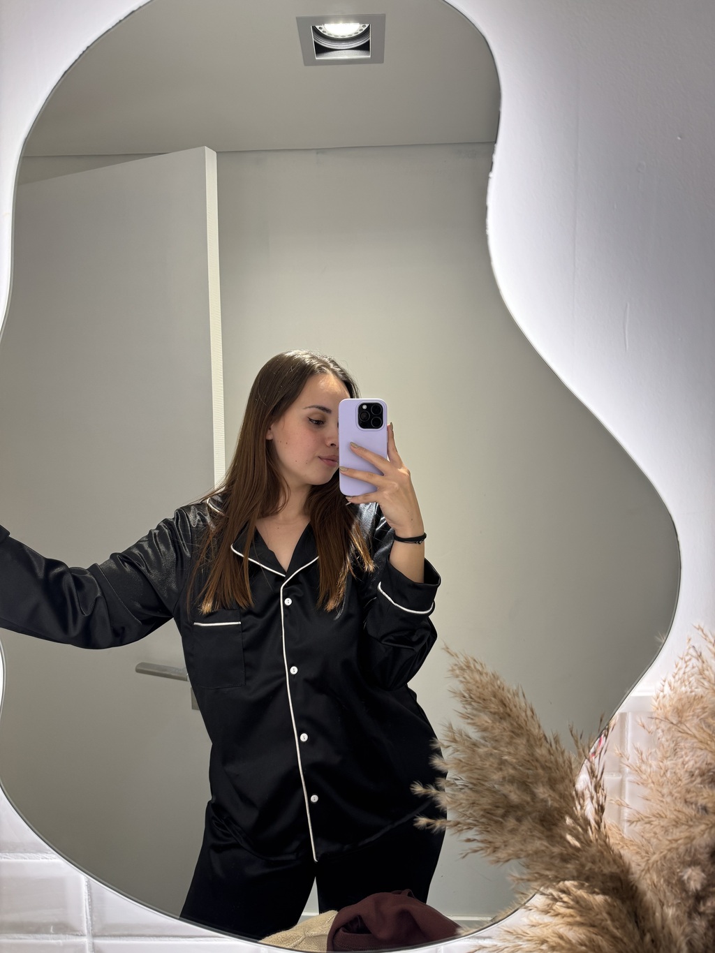 Los vivos a contratono recorren el cuello, los puños y el borde inferior, creando un contraste elegante que resalta los acabados precisos del pijama. La tela tiene un toque de elasticidad, lo que permite un ajuste cómodo y libertad de movimiento sin perder su forma. Un conjunto diseñado para quienes buscan detalles sofisticados y máxima comodidad en su ropa de descanso.