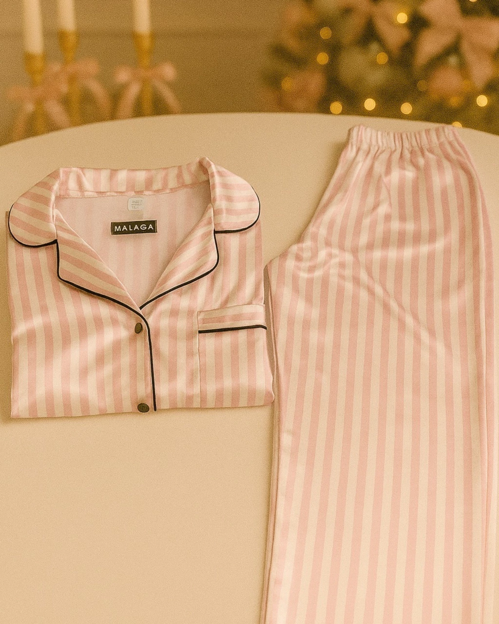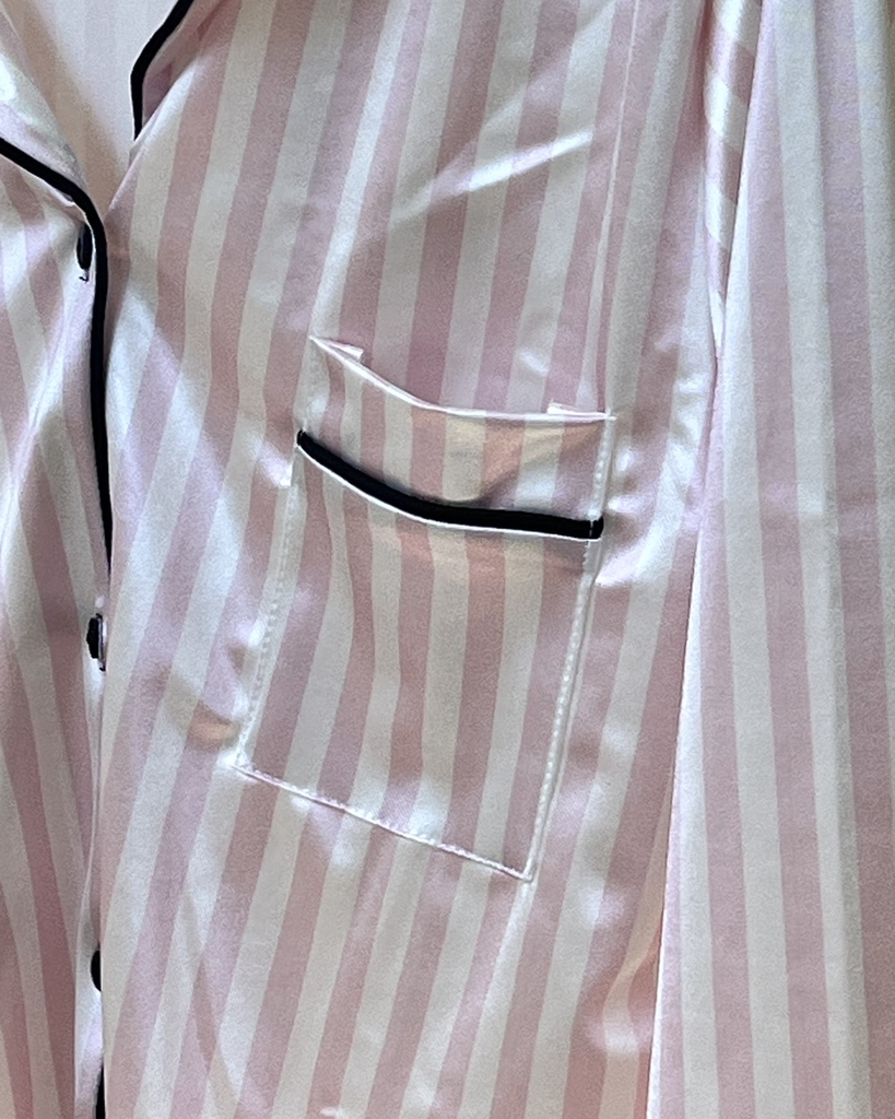 Los vivos a contratono recorren el cuello, los puños y el borde inferior, creando un contraste elegante que resalta los acabados precisos del pijama. La tela tiene un toque de elasticidad, lo que permite un ajuste cómodo y libertad de movimiento sin perder su forma. Un conjunto diseñado para quienes buscan detalles sofisticados y máxima comodidad en su ropa de descanso.