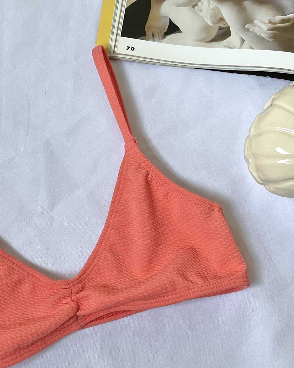 Corpiño top escote V texturado con frunce en el centro de escote, tiene elastico en la totalidad de su controno. La tela es texturada y tiene forreria interna en frente y espalda (con doble rebote, que elastiza en todos los sentidos)