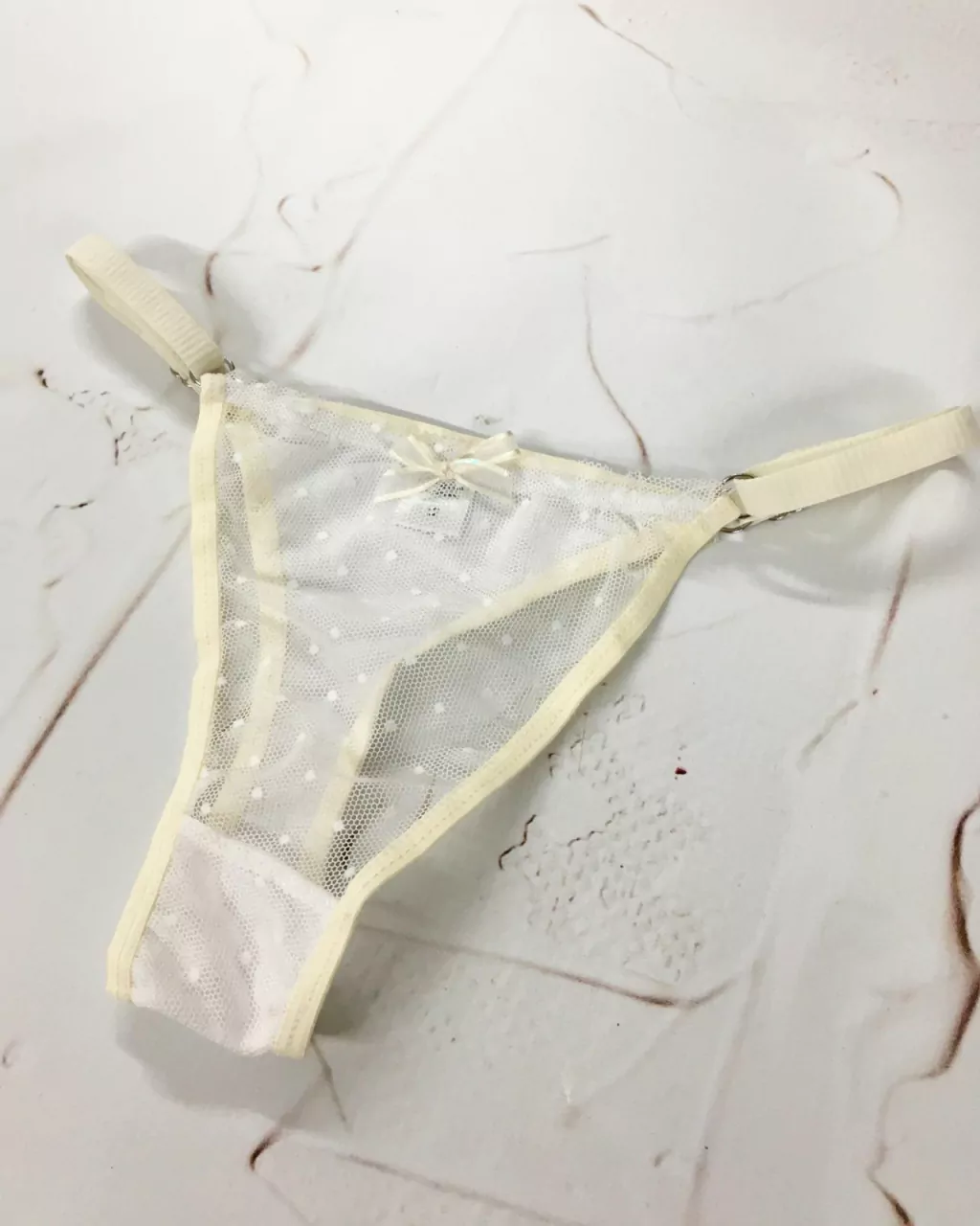 Bombacha colaless regulable, con elastico en contorno de piernas. Los herrrajes son de zamak (antioxidantes y antialergicos). Los breteles de contorno de cadera permite regular las bombachas hasta un talle mas grande. Incluye refuerzo de algodón, para mayor cuidado personal e higiene. Todos los productos son fabricacion propia. Tela: Tull plumetti